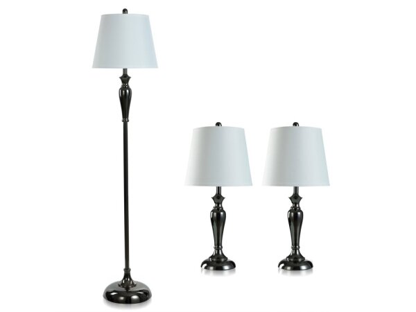 Black Nickel Set Two Table Lamps & One Floor Lamp With White Hardback Shades 100 Watts