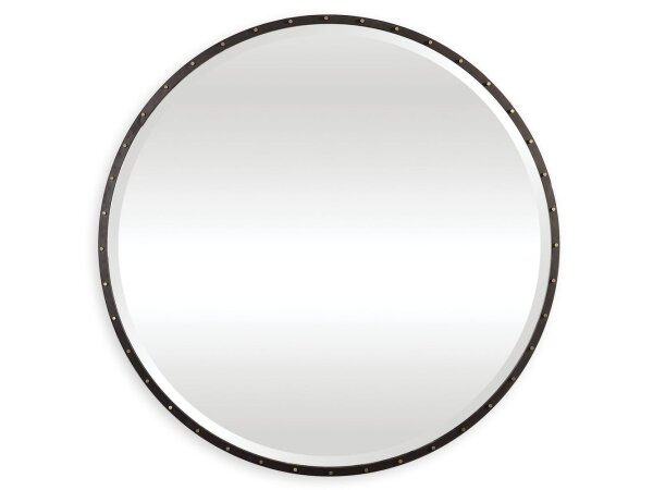Sleek entertainment console in rustic black mango wood with a gold-finished iron base and hammered oval hardware. Includes removable shelves behind doors and a ventilated back, fitting up to a 70 in. TV.