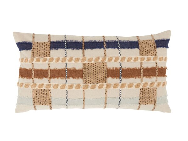 Complete your coastal oasis with this multicolored pillow crafted with stripes and squares. Hand-cut and appliqued linen with frayed edging