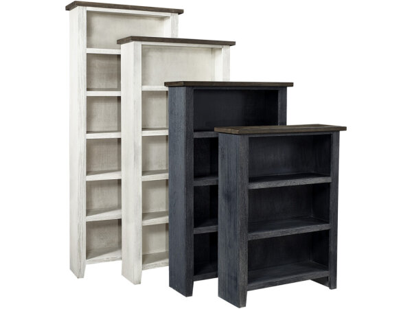 Rustic etagere bookcase with a contrasting Avalanche white exterior and warm hickory/maple interior. Includes 1 fixed and 3 adjustable shelves for flexible display.