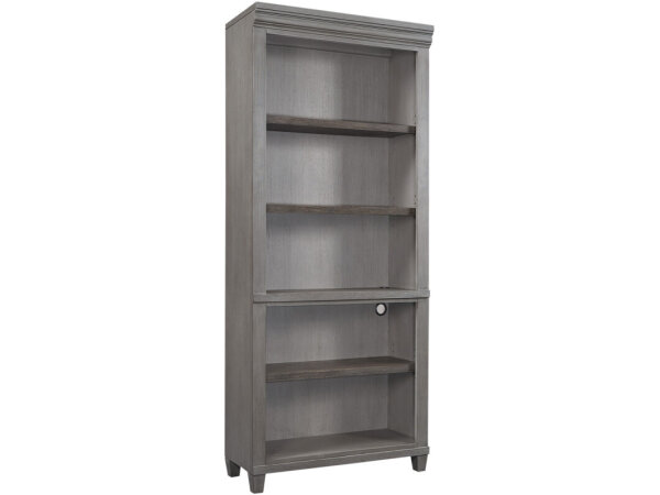 Bookcase in Grey Mink alder veneers with a patterned back panel and tapered legs. Four fixed wood-framed glass shelves and a puck light with 3-level touch control highlight displays.