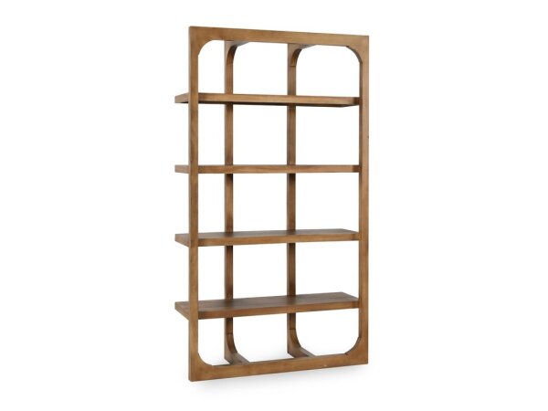 Tall etagere bookcase in oak veneers with a soft smoked gray Mink finish, featuring a classic X-back and four fixed shelves. Includes anti-tip hardware for safety.