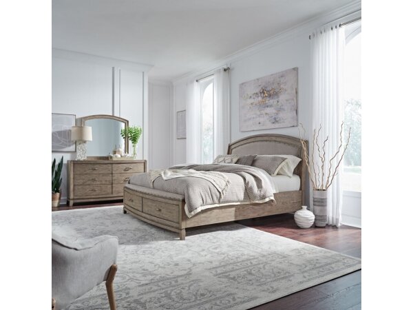 This Avalon queen storage footboard features rubberwood solids, split heart white oak veneers, and a burnished beige finish. It offers two cedar-lined storage drawers, a padded oatmeal linen upholstered bench with nailhead trim, and elegant bow shaping.
