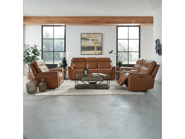 This Cooper loveseat in Camel semi-aniline top grain leather features triple power zero gravity recline with power articulating headrest and lumbar support. It includes a console with hidden cupholders, wireless charging, and multiple USB ports, plus memo