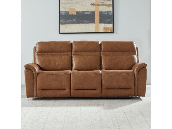 The Cooper sofa features Camel semi-aniline top grain leather with triple power zero gravity recline, power articulating headrest, and lumbar support. Constructed with solid hardwood, it includes memory foam in the seats and USB-A & USB-C charging ports f