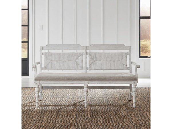 This River Place panel back bench, crafted from pine solids with a Riverstone White finish, features a woven weave panel back and a padded seat upholstered in textured linen. It includes scrolled arms and heavy turned legs with nylon glides for floor prot