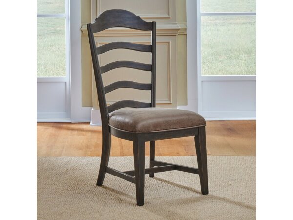 This Paradise Valley upholstered ladder back arm chair is crafted from rubberwood solids with a Saddle Brown finish and distinct traditional styling. It features a padded seat upholstered in tobacco leather-like fabric, shaped scrolled arms, and nylon gli