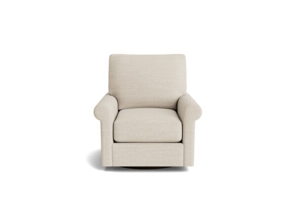 Roll-arm swivel chair with a deep, plush cushion for comfortable lounging and smooth rotation. Fabric upholstery, artisan-crafted in the USA with customizable designer fabrics and cushion options.