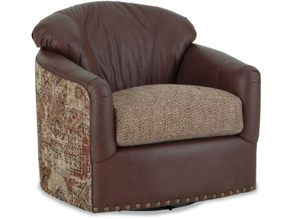 Leather swivel glider chair with slope arms, loose seat cushion and pillow back for comfortable support. Contemporary accent seating that swivels and glides to fit any room.