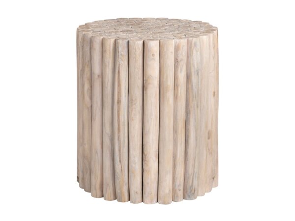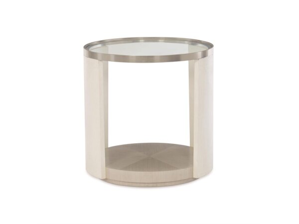 This contemporary City Scape chairside table is crafted from rubberwood solids and split heart white oak veneers with a Burnished Beige finish. It features shelving suspended by metal tubing for storage and a floating design.