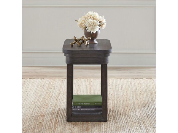 This European-designed chair side table is crafted from poplar solids with white oak and birch veneers, in an antique white and weathered bark finish. It features a full extension drawer, an adjustable shelf behind a wood-framed mirrored door, and a fancy