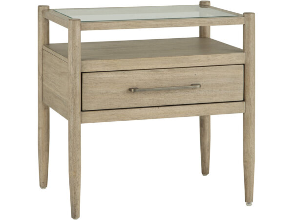 Demilune chest in champagne leaf linen with handpainting and silver floral knobs. Two doors open to a fixed shelf with a vertical divider creating four interior compartments.