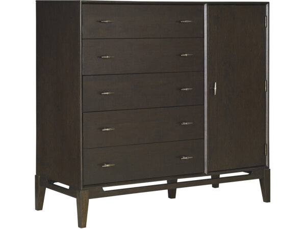 This Carolina Park 5-drawer chest is crafted from Rubberwood solids and Split Heart White Oak veneers with an Amber Brown finish. It features a felt-lined top drawer, a cedar-lined bottom drawer, soft-closing drawer guides, and Burnished Bronze hardware.