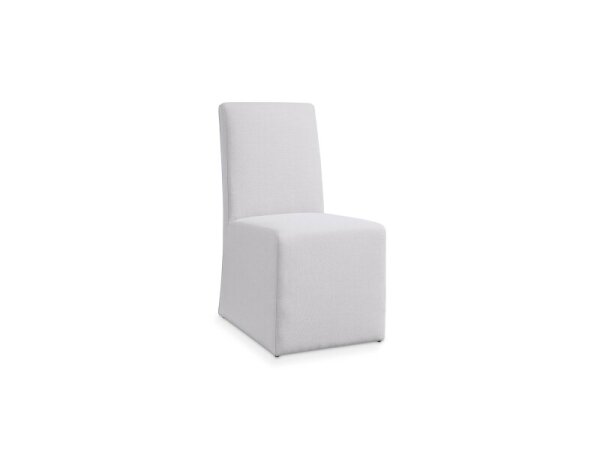 Slipcover-inspired upholstered dining chair on casters for easy positioning, scaled to suit both small and large dining spaces for comfortable seating.