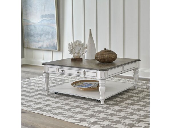 This oversized square cocktail table showcases European design, crafted from poplar solids with white oak and birch veneers, and an antique white and weathered bark finish. It features two full extension drawers, a fancy face top, and a bottom shelf, with