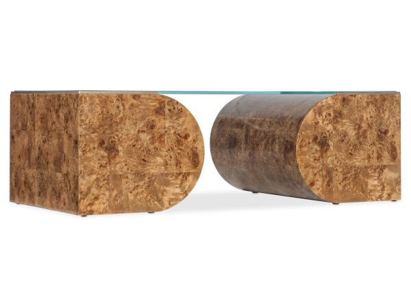 Coffee table featuring tiled mappa burl veneers in a warm golden finish beneath a clear tempered-glass top. Gold trim adds a refined transitional look.