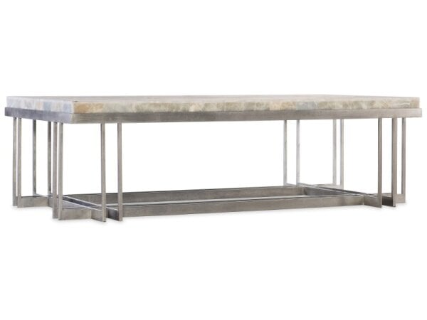 This Modern Farmhouse oversized square cocktail table is crafted from poplar solids with knotty white oak veneers, featuring a dusty charcoal finish and heavy distressing. It offers a high-low planked top, a bottom shelf for storage, and casters for easy