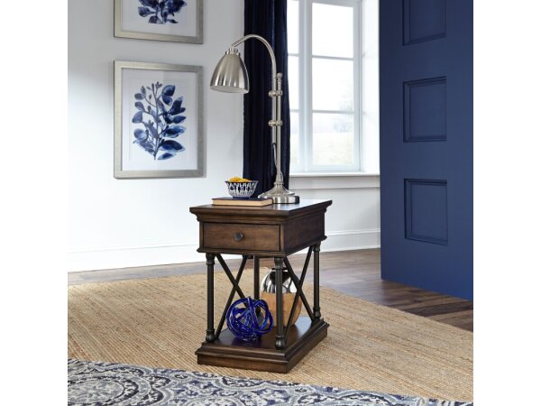 The classic Tribeca chair side table is crafted from poplar solids and birch veneers with a cordovian brown finish. It offers a full extension drawer, a bottom shelf for storage, walnut inlay, and X metal accents.