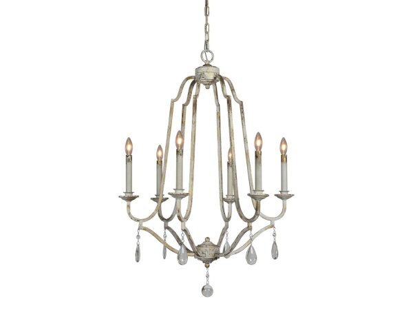 Evie Chandelier – The Evie Chandelier defines vintage charm with its gracefully curved metal frame in a distressed cottage white