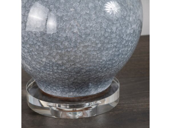 The Crestview Collection Perry Table Lamp features a soft gray, crackled finish with distressed marks. The ceramic body has scalloped