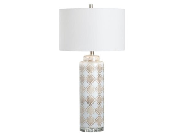 The Crestview Collection Diamonte Table Lamp boasts a classic cylinder silhouette adorned with a subtle monochromatic diamond pattern. Mounted on