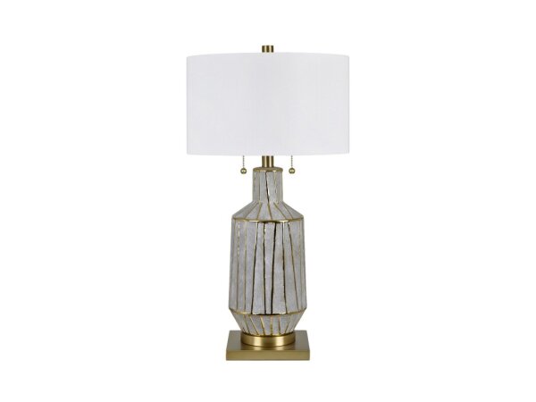The Crestview Collection Caldwell Table Lamp showcases striking contrasts with its matte glaze intersected by bold metallic gold accents. The