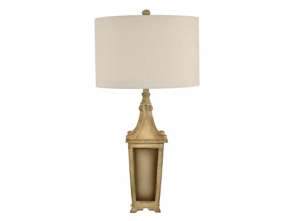 The Crestview Collection Lantern Table Lamp has a charming tapered design, standing on four separate feet. The center of the