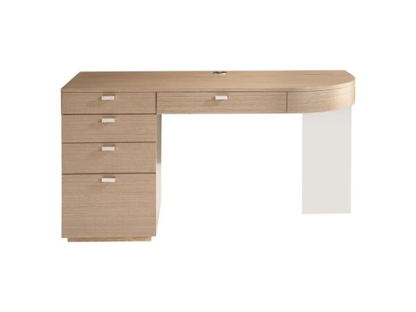 This Modern Farmhouse writing desk is crafted from poplar solids and knotty white oak veneers, featuring a dusty charcoal finish with heavy distressing. It includes three full extension drawers, slat accents, and washed brass elongated bar pull hardware f
