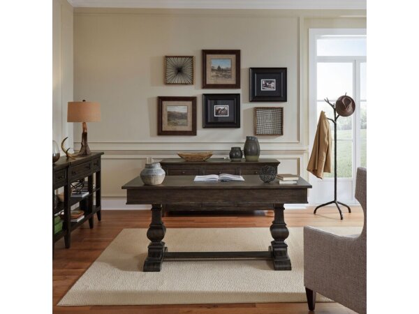 Crafted from rubberwood solids and split heart white oak veneers, this writing desk features a Saddle Brown finish. It includes three full extension drawers, a flip-down keyboard tray, and wire management provisions.