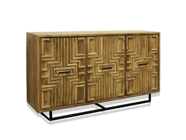 This rustic Double Bridge sideboard is crafted from rubberwood solids and acacia veneers with a dark chestnut finish. It offers multiple storage options, including an adjustable shelf, felt-lined drawers with full extension glides, and removable X-shaped