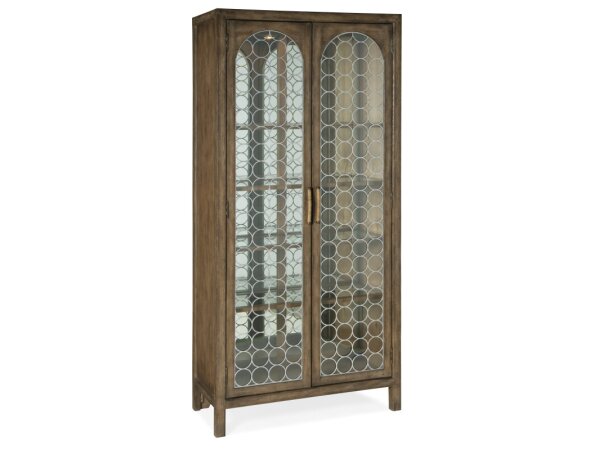 Display cabinet with glass front and sides, adjustable glass shelves, LED lighting and mirrored back panels. Brushed brass framing and a Desert Oak finish add modern warmth.