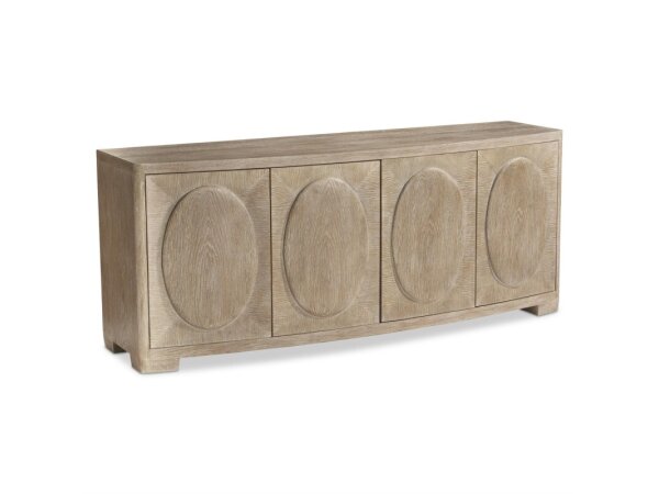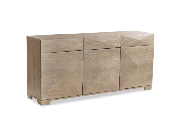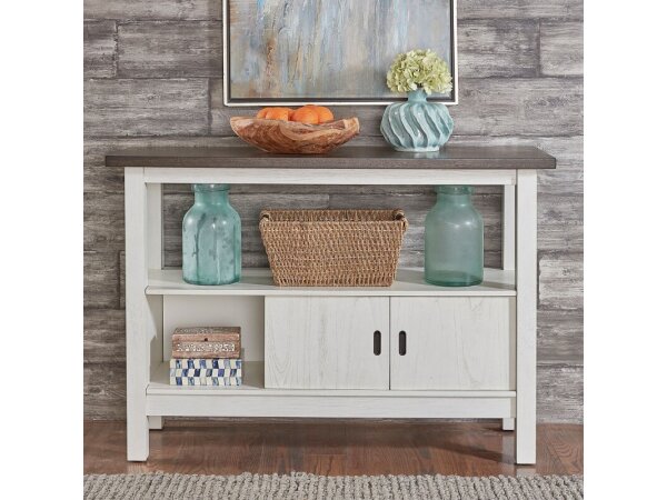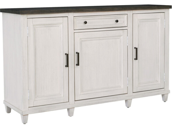 The Brook Bay sideboard is crafted from rubberwood solids and mindy veneers, featuring a two-tone carbon gray and textured white finish. It offers two sliding doors with black metal hardware, an adjustable shelf, and an open shelf for storage or display.