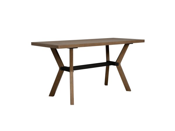 Trestle dining table with a Vintage Natural top and Charred Timber X-base, crafted of Pecky Hickory veneers with a solid-wood edged top. Includes two 20 in. leaves to extend the table to 132 in.