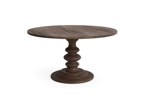 Round dining table with a 1.25 in. solid oak top and turned pedestal base, finished to highlight natural grain. Available in 48–60 in. diameters; seats 4–6.