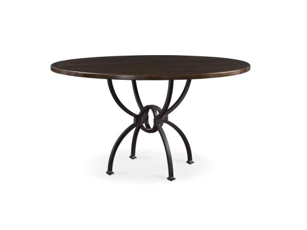 Round pedestal dining table with a 1.25 in. solid hardwood top and a forged metal base in antiqued bronze. Available in 48, 54, or 60 in. diameters to seat 4–6.
