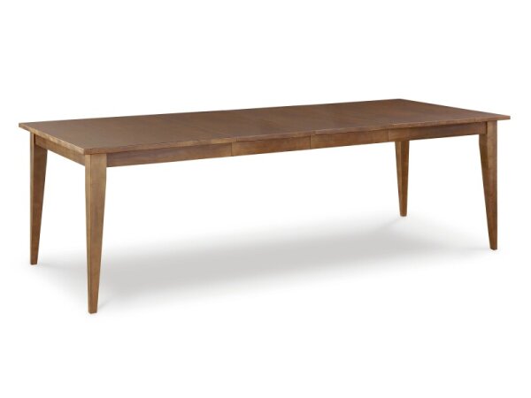 Rectangular dining table with a maple-veneered top and solid Silver maple legs for flexible, modern spaces. Includes a matching leaf to expand seating from 4-6 to 8-10 with a seamless apron design.