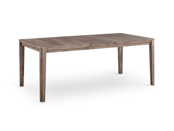 Rectangular dining table with a maple-veneered top and solid Silver maple legs for flexible, modern spaces. Includes a matching leaf to expand seating from 4-6 to 8-10 with a seamless apron design.