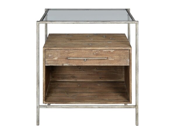Crafted from Poplar solids and Oak veneers with a Weathered White finish, this Lake House end table features a planked top, a bottom shelf, and a storage drawer with Antique Brass hardware. It boasts a multi-step hand-applied finish and tapered legs.