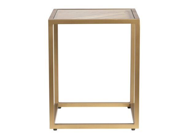 This Bayhill Trellis end table, crafted from rubberwood solids and white oak veneers, features a honey finish, a tempered glass top, and a metal checkerboard accent. It offers an open bottom shelf for storage or display.