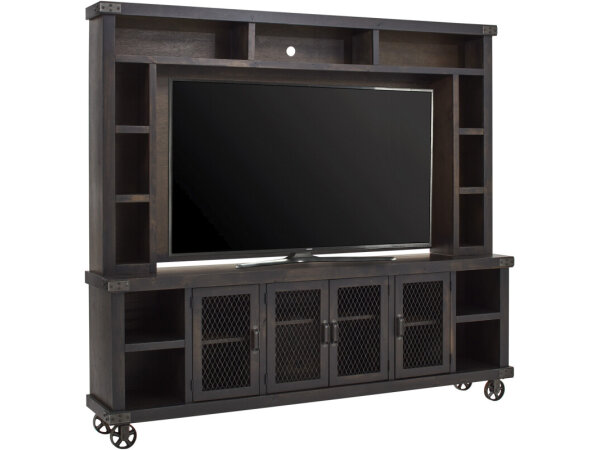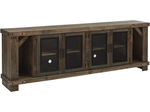 This European-designed Magnolia Manor hall console features poplar solids with white oak and birch veneers, finished in weathered brown with whitewash. It offers three mirrored doors, two adjustable shelves, and wire management provisions, suitable for an