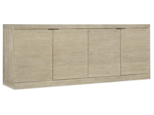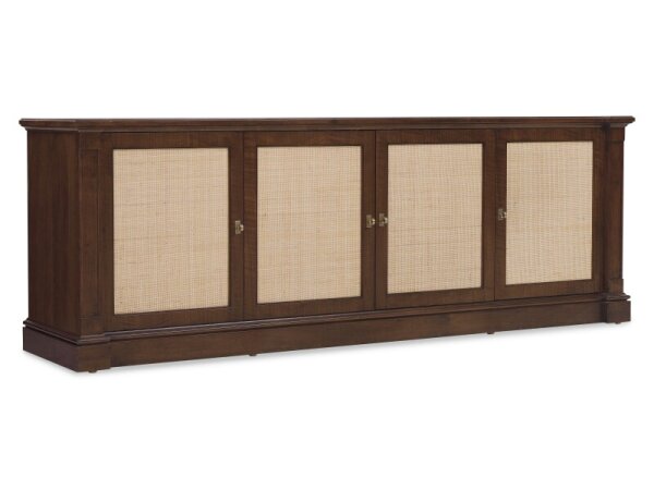 The Paradise Valley entertainment hutch is crafted from rubberwood solids and white oak veneers with a saddle brown finish. It features heavy top crown, chamfered pilasters, bead molding, touch LED lighting, and wire management provisions, perfect for cre