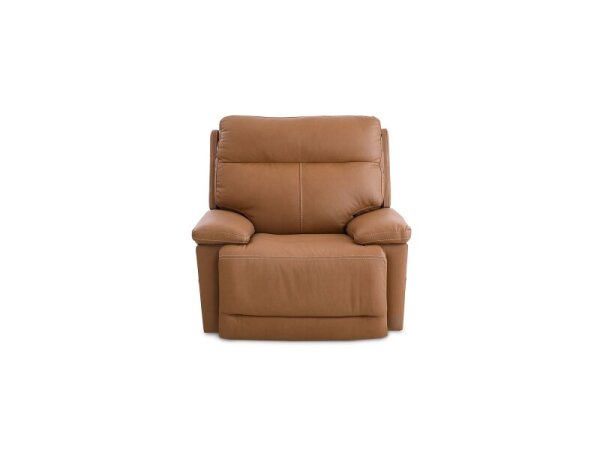 Leather zero-gravity power recliner with power-adjustable headrest and built-in USB charging. Split back, padded arms, and topstitching deliver modern comfort and support.