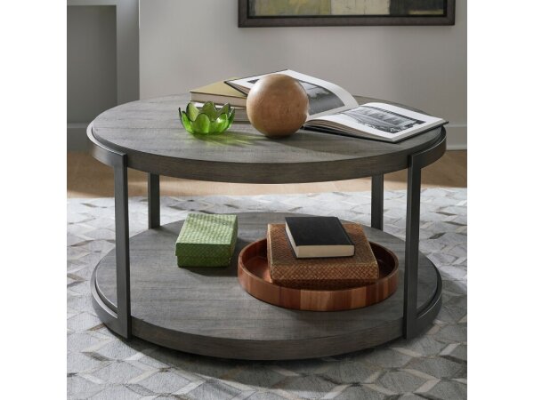 This round cocktail table top features a gauntlet gray finish with wirebrush distressing, crafted from MDF with split heart oak veneers and dark pewter metal legs. It offers an open shelf design for a clean look and is designed to pair with its base.