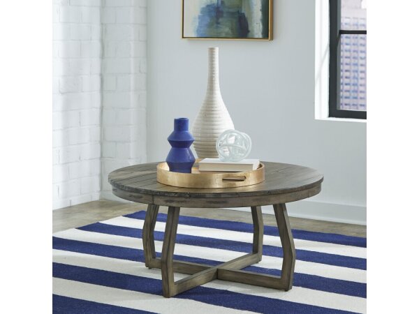 This cocktail table is crafted from poplar solids with a gray wash finish and steel brush distressing, featuring an appealing planked top. It is anchored by a unique angled intersecting base design.