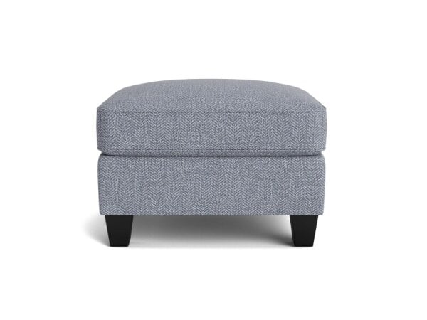Moderately scaled fabric ottoman with welted seams and removable tapered walnut legs. Measures 26W x 21D x 18H in., sized to complement a swivel glider or living room seating.