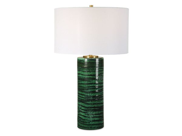 This table lamp features a ceramic base finished in a two-toned dark and light emerald green glaze with an abstract