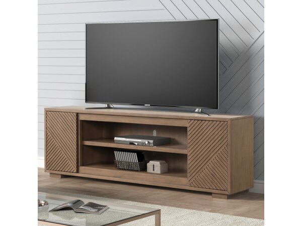 This 84-inch TV console is designed to accommodate an Infinity 50-inch firebox (sold separately) via a removable center shelf. It features two reeded pattern doors with European soft-close hinges and adjustable shelving.
