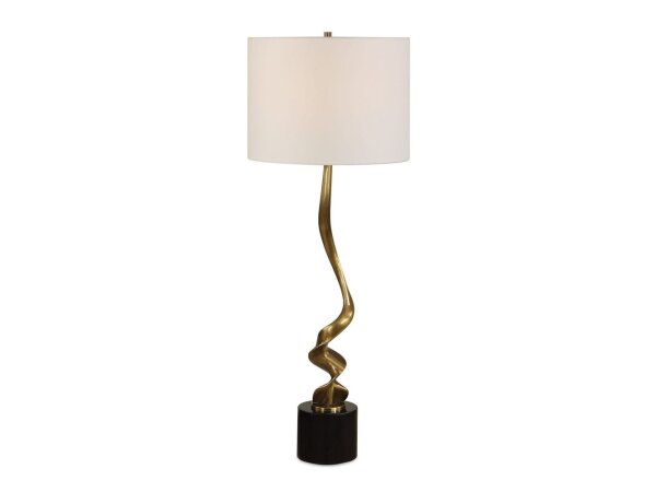 This striking table lamp features a gracefully curved base in a warm bronze finish, accented by plated antique brass details.