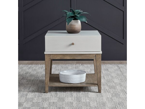 A compact chairside table offering a single storage drawer and a clean, contemporary look with square tapered legs. The design is finished with khaki wood knob hardware and a subtle two-tone finish.
