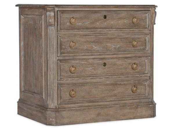 Lateral file cabinet with two locking file drawers on full-extension slides for easy access and security. Cathedral Oak veneers in a Claro finish with champagne-colored pulls.